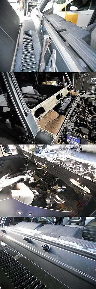フロントインパネ脱着してある状態です。内側ほとんど全部外しました。スポット溶接機が入らないのと、溶接をするので燃えないように外してあります。