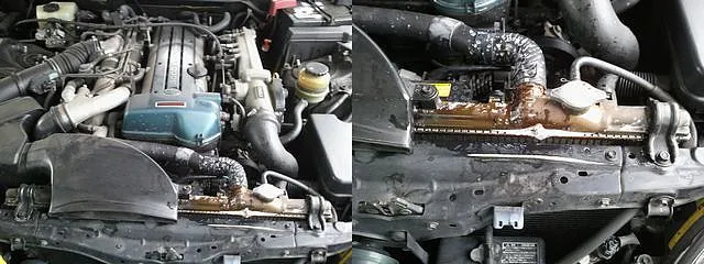 写真右側 ラジエーターのアッパータンク~泡吹いています。