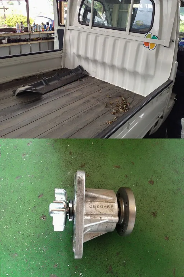 ベルト類を外し、ベアリング、ダイナモ、セルモーターと点検して行くと、ウォーターポンプがガタガタになっていました。ここまでひどい状態なのは、初めてですね。